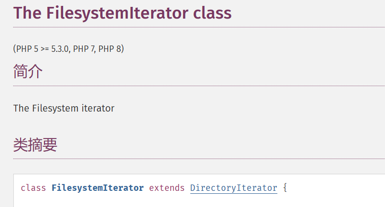 Filesystemlterator(PHP 5 >= 5.3.0, PHP 7, PHP 8)查看官方文档可以知道Filesystemlterator继承于Directorylterator